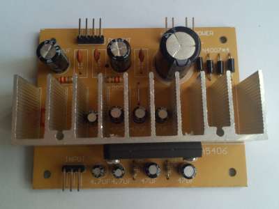 4.安装25V 2200UF电解电容,BA5406和散热片用螺丝固定后插在电路板上再焊接并用螺丝固定在电路板上。说明:INPUT的3针,中间为地,两边是左右声道信号输入端,OUTPUT的4针,中间两根为地,边上的为左右声道输出端。音调和音量调节部分已提供原件,分别为2.2K电阻2个,0.1UF涤纶电容2个,10K双联电位器2个,10K单联电位器1个,只需按照原理图焊接即可。