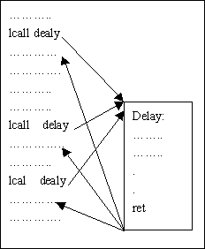 (2)调用及回过程:主程序调用了子程序,子程序执行完之后必须再回到主程序继续执行,不能“一去不回头”,那么回到什么地方呢?是回到调用子程序的下面一条指令继续执行(当然啦,要是还回到这条指令,不又要再调用子程序了吗?那可就没完没了了……)。参考图1